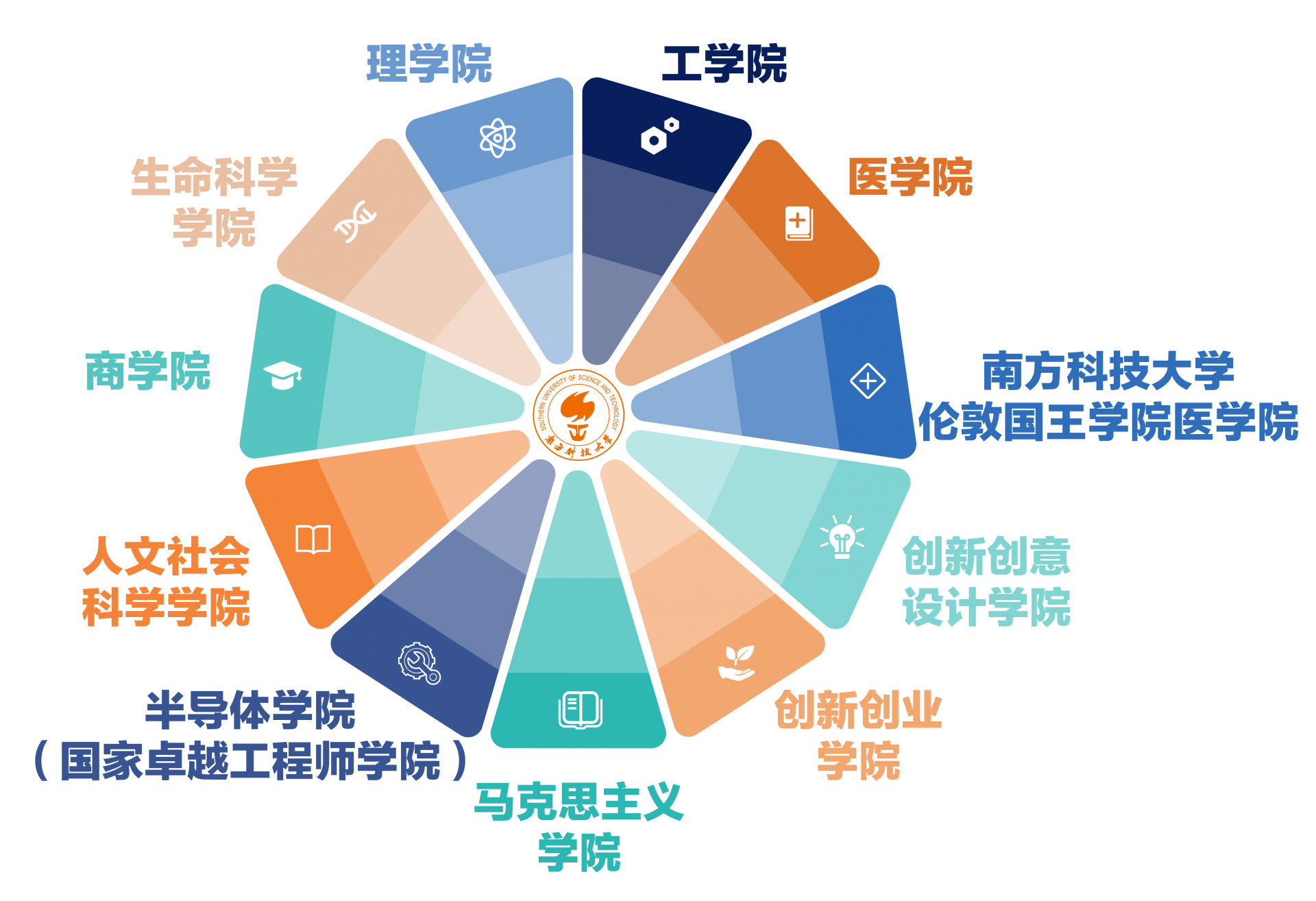 學(xué)校目前已設(shè)置理學(xué)院、工學(xué)院等十大學(xué)院,建成33個院系及若干中心,開設(shè)41個本科專業(yè)。2018年,南科大入選博士學(xué)位授權(quán)單位及碩士學(xué)位授權(quán)單位。建校至今,已獲一級學(xué)科博士點14個,專業(yè)類別博士點3個,一級學(xué)科碩士點15個、專業(yè)類別碩士點8個,博士后流動站7個。