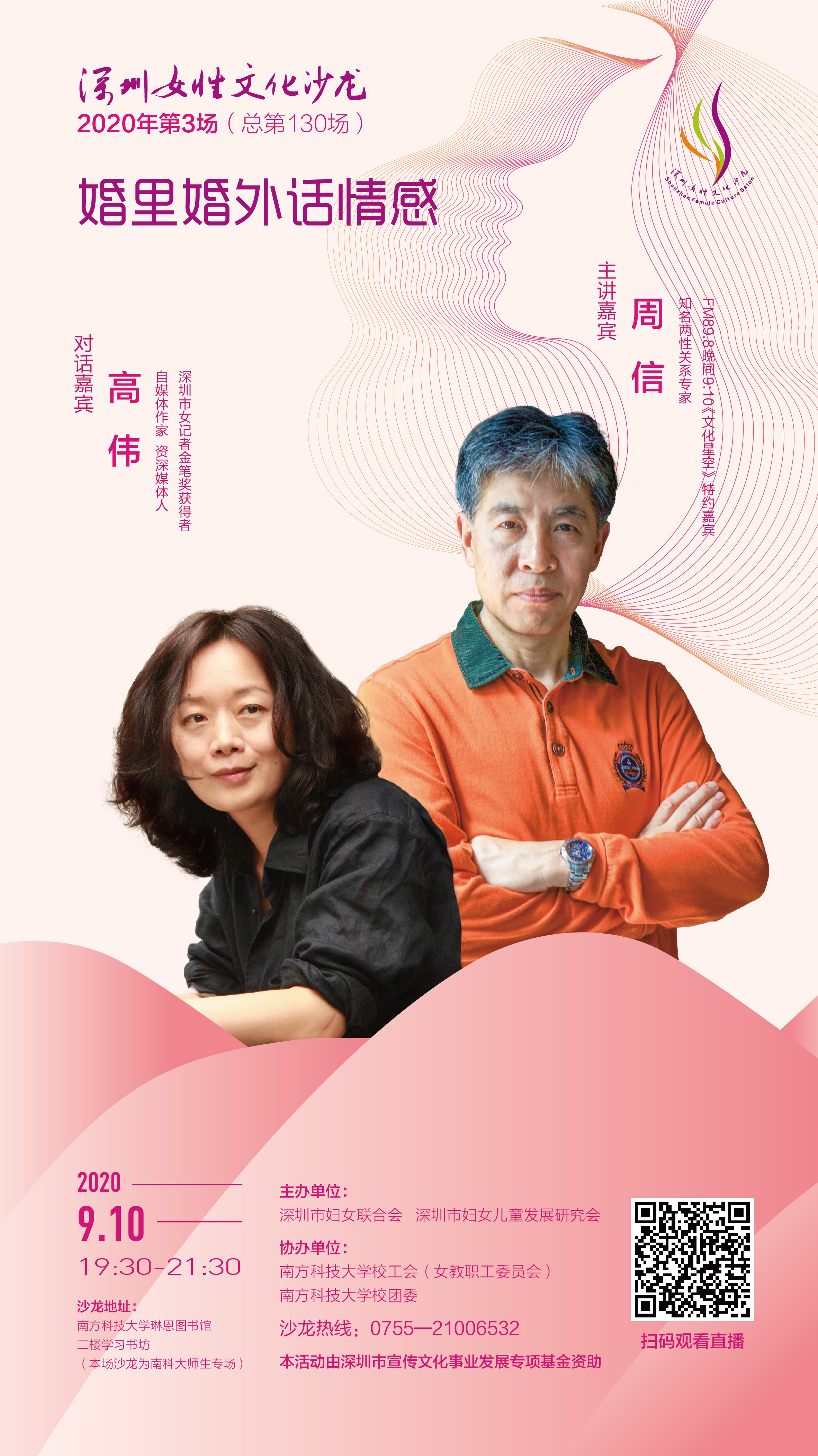 9月10日(周四)晚7:30,第130期深圳女性文化沙龍首次走進(jìn)南方科技大學(xué),特邀知名兩性關(guān)系、情感專家周信“周老爺”,與文藝才女、自媒體作家高偉女士做客學(xué)習(xí)書坊“談情說愛”,同臺(tái)共話《婚里婚外話情感》,帶你認(rèn)知愛情與婚姻的本質(zhì),提升愛的能力,學(xué)習(xí)情感智慧,破解婚戀迷局,為愛保駕護(hù)航,伴你走向“執(zhí)子之手、與子偕老”的美好境界,在關(guān)系中彼此成就,在相愛中共同成長,收獲幸福美好人生。沙龍熱線:0755——21006532,本場(chǎng)沙龍為教師節(jié)南科大師生專場(chǎng)。